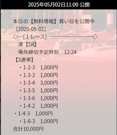 | 日付 | 会場 | 買い目 | 結果 | 金額 |